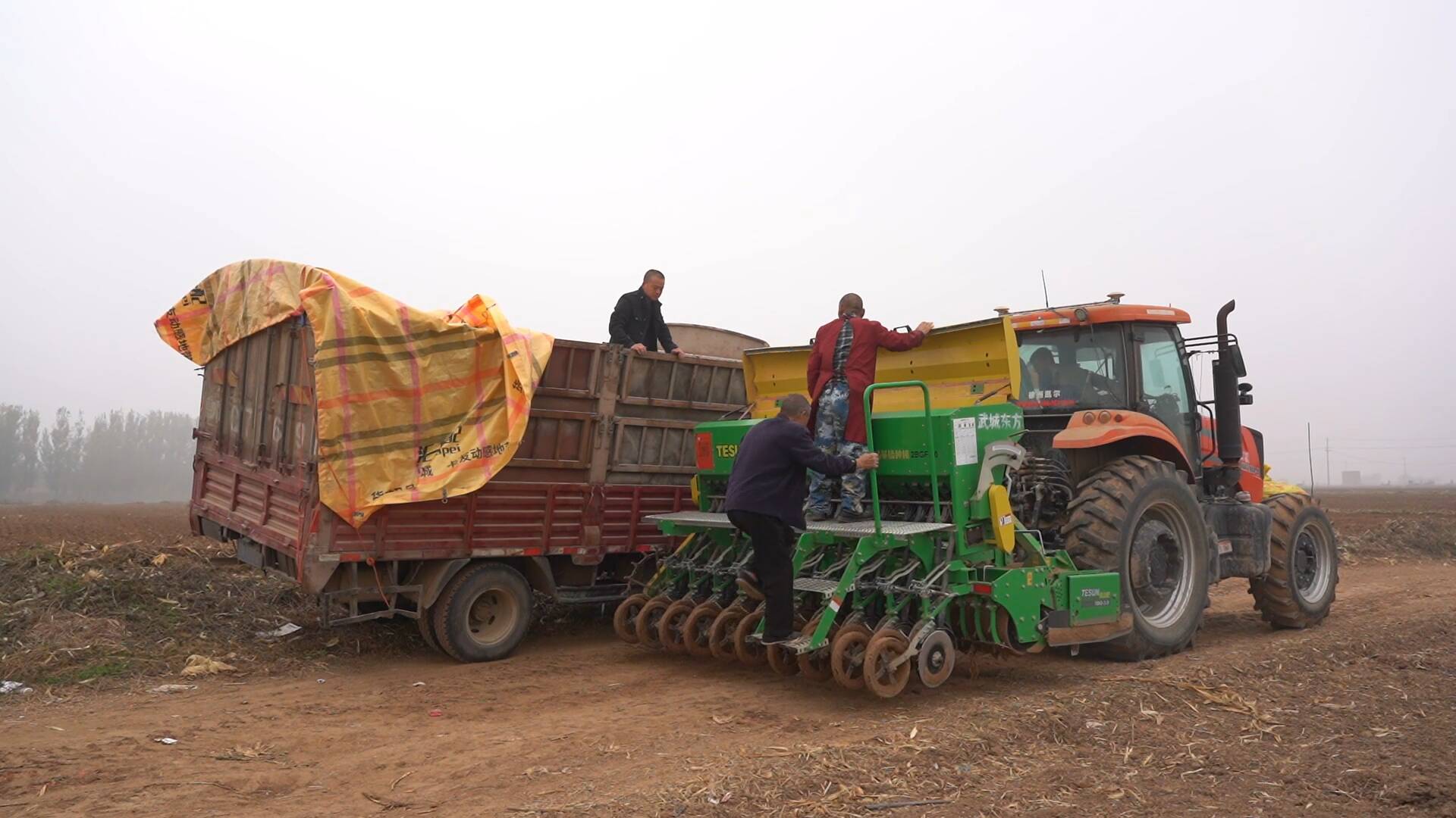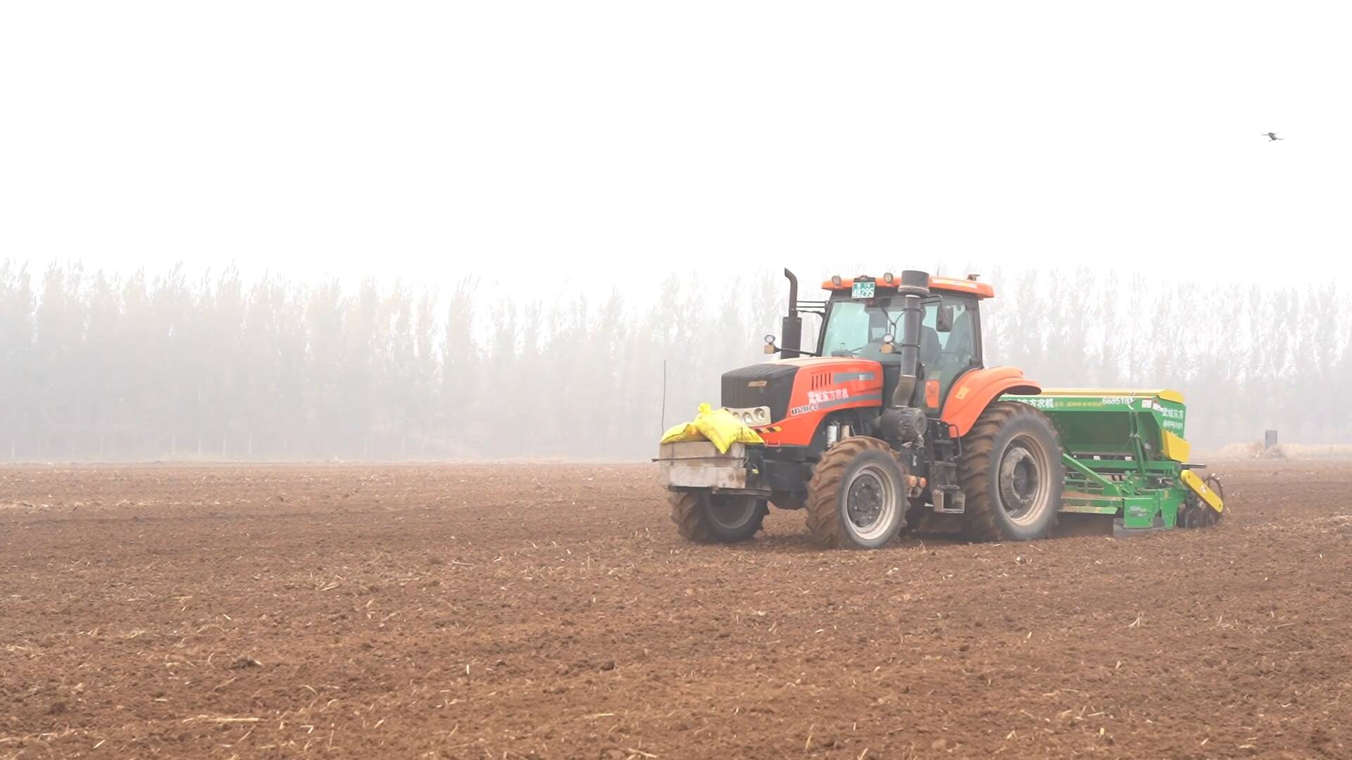 早晨6点,在甲马营镇的一处农田,还笼罩着一层薄薄的晨雾,农户已经来到这里抢种冬小麦。由于前期降雨导致土壤含水量偏高,此处农田进行了至少2次的深翻晾墒。早晨5点多,当地下了一阵小雨,为避免耽误播种牛盘宝,种粮大户紧急调配了6台高效播种机,趁雨停抢种冬小麦。
